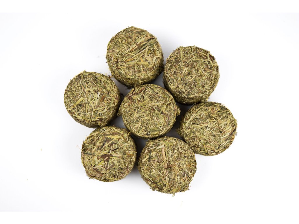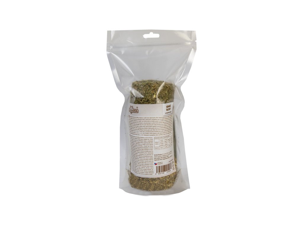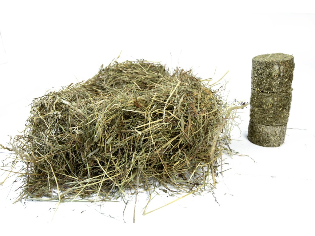 Složení: Seno z luk (může obsahovat: bojínek luční, ovsík vyvýšený, medyněk vlnatý, kostřavu červenou, lipnici obecnou, kostřavu luční, srhu říznačku, psárku obecnou, jetel plazivý, jetel luční, krvavec toten, kopretinu bílou, jitrocel kopinatý, druhy zvonku a další). Obohaceno o: pampelišku.