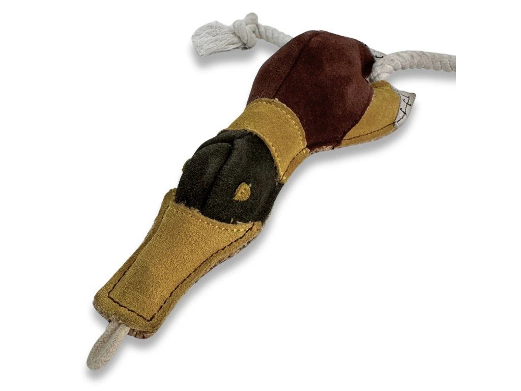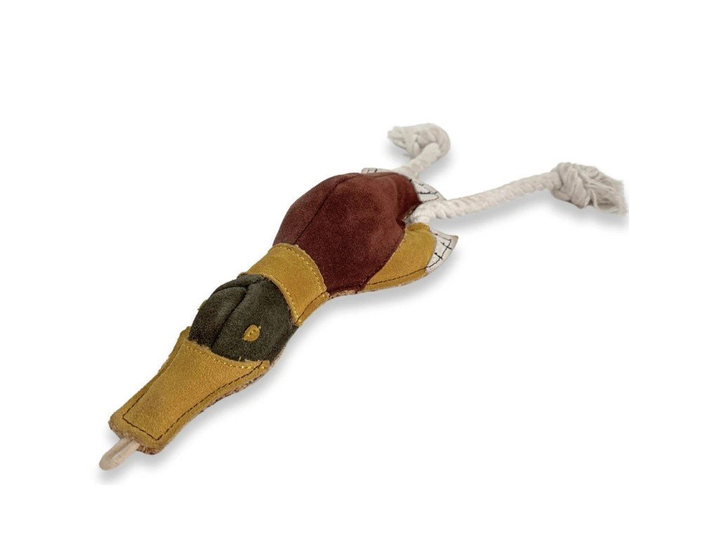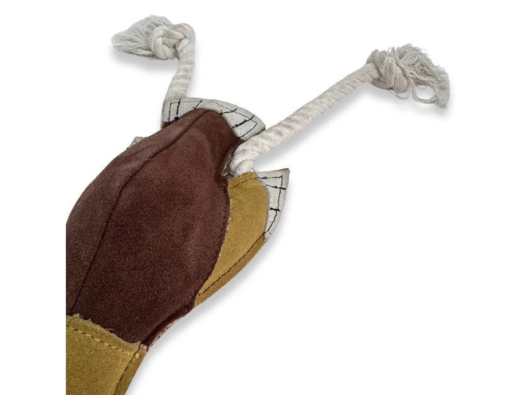 Kůže použitá na hračce je barvena zdravotně nezávadnými barvami. Při kontaktu se slinami nebo vodou může barva mírně pouštět, ale to pejskovi nijak neuškodí.