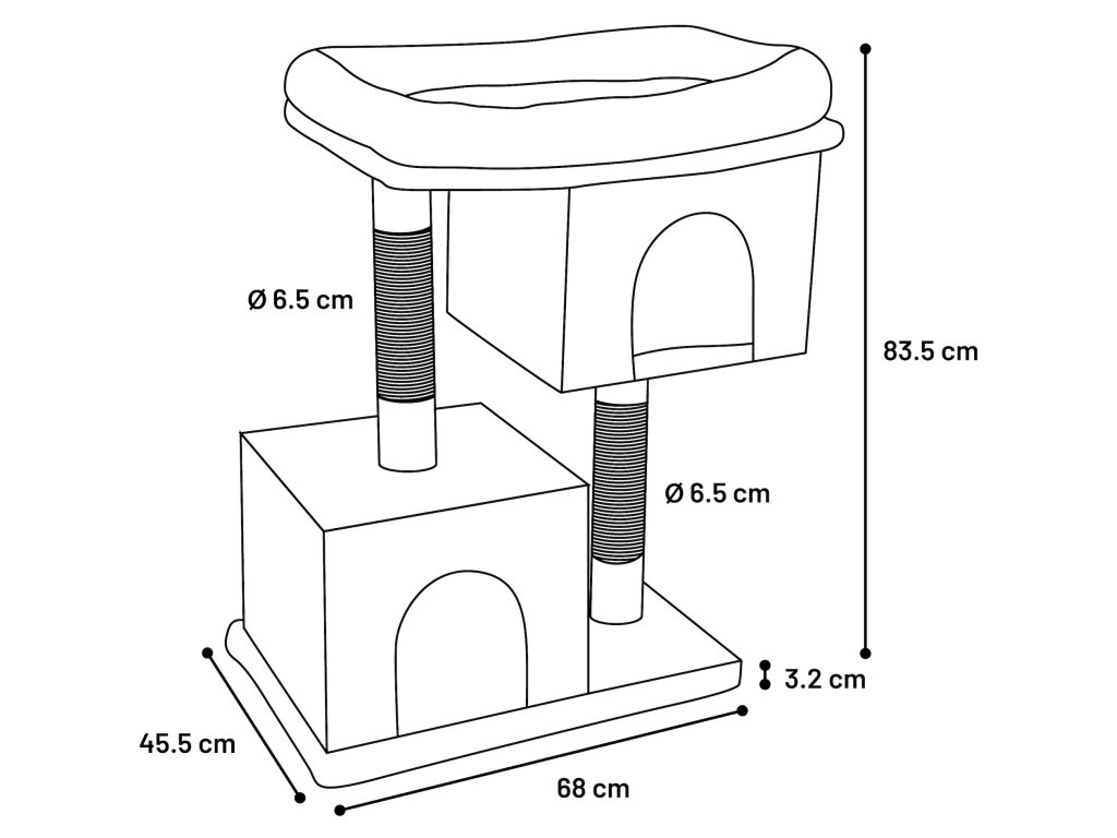Škrabadlo Kajal představuje dokonalou relaxační oázu pro Vaše chlupaté kamarády. Je potaženo měkkým plyšem, škrabací sloupky jsou omotány sisalovým lanem. Dále disponuje polstrovaným pelíškem a 2 úkryty. Pelíšek je vyjímatelný a lze prát v pračce na 30 °C.