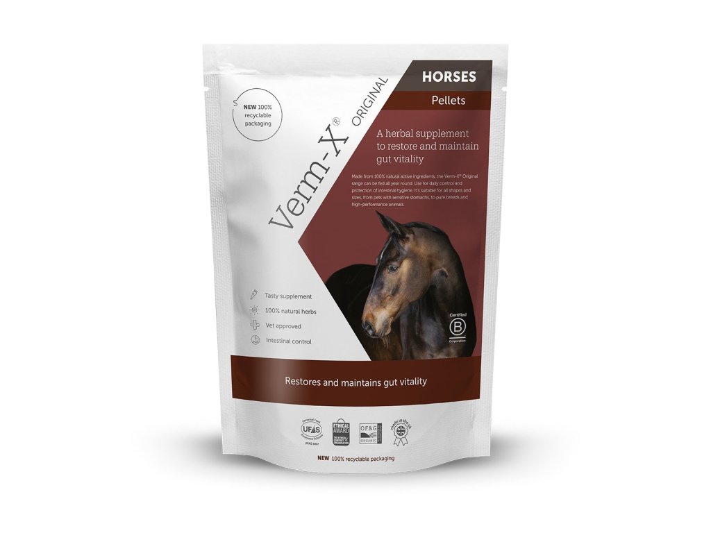 Verm-X® pro koně a poníky proti střevním parazitům, je složen ze směsí bylinných přísad, které obsahují komplex aktivních částic, používající se během stovek let. Udržuje všechny oblasti hygieny zažívacího traktu, ať už kontrolu nebo ochranu. Granule mohou být podávány přidáním do krmiva nebo samostatně jako pamlsek. Kromě bylinek podporujících zažívací hygienu obsahuje Verm-X® i bylinky podporující proces čištění krve a udržování správné funkce střev. Naši zákazníci nám říkají, jak dobře vypadají jejich koně a poníci po užívání Verm-X®. Po užití přípravku Verm-X® je jejich srst opět zářivá a lesklá a jejich celková kondice se velmi zlepší. Při používání přípravku Verm-X® je vhodné, aby kontrola stolice (fekální okultní test) byla provedena 21 dní po posledním užití přípravku Verm-X®.