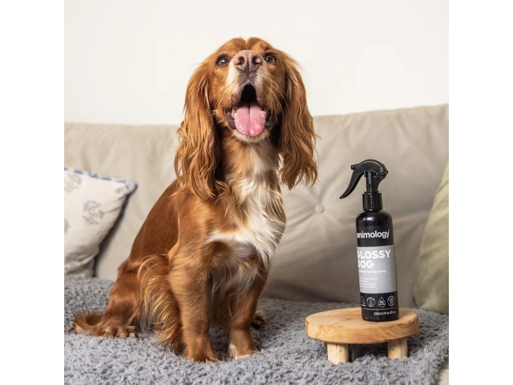 Animology Glossy Dog je pečující sprej obohacený o směs vitamínů B, C a E. Obsahuje také extrakt z aloe vera a pečující složky, které napomáhají udržovat srst psa čistou a zdravou.