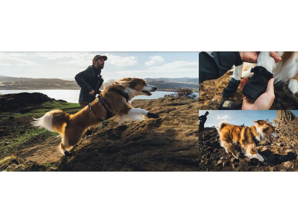Gumová podrážka poskytuje vynikající kontakt s terénem a ochranu tlapek, zatímco systém zapínání na suchý zip vytváří bezpečné uchycení, takže bota zůstává na místě při každém kroku.