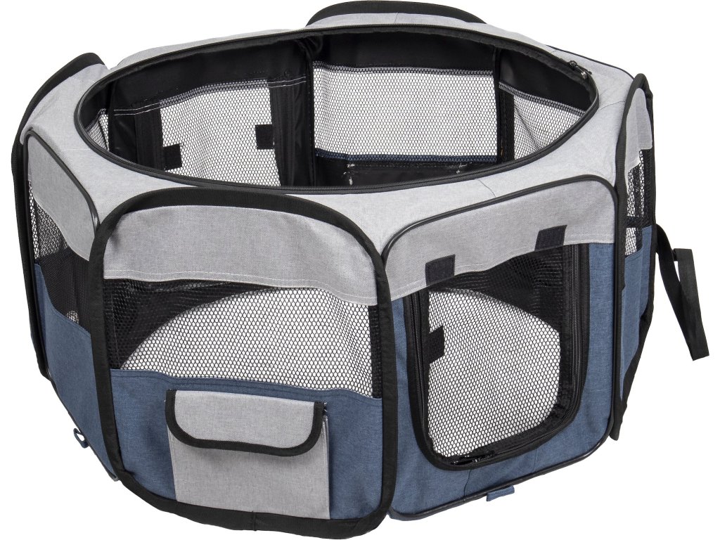 Cestovní ohrádka pro psy je praktická a lehká. Jednoduše se složí do velikosti tašky, a proto si ji můžete vzít všude s sebou. V přední a zadní části je vstupní otvor na zip. Vrchní síťka je odnímatelná. Praktická kapsa na boční straně Vám umožní uschovat potřebné věci.