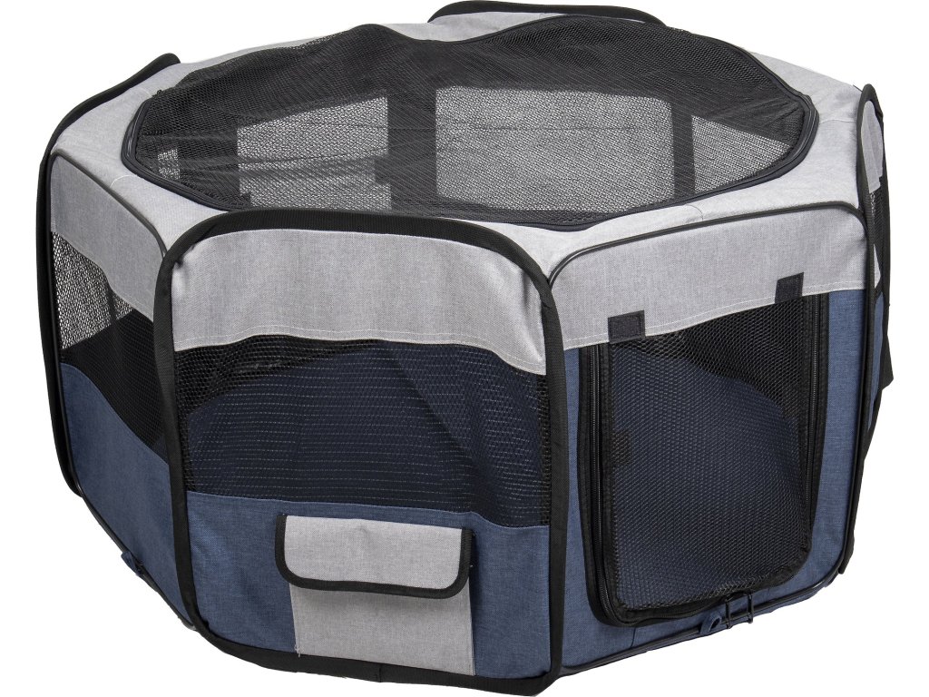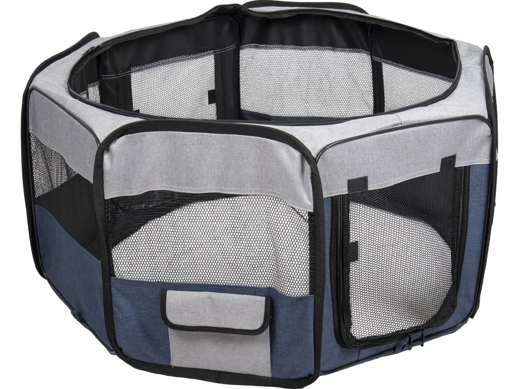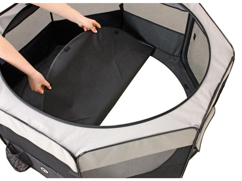 Cestovní ohrádka pro psy je praktická a lehká. Jednoduše se složí do velikosti tašky, a proto si ji můžete vzít všude s sebou. V přední a zadní části je vstupní otvor na zip. Vrchní síťka je odnímatelná. Praktická kapsa na boční straně Vám umožní uschovat potřebné věci.