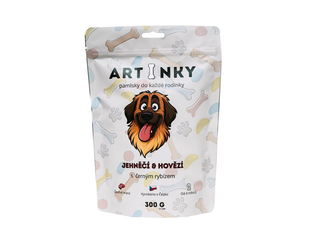 ARTINKY jsou poloměkké pamlsky pro psy vyrobené v České republice. ARTINKY představují kvalitní doplňkové krmivo pro psy, které spojuje vysoký podíl živočišných surovin, jednoduché složení a skvělou chuť. Receptura kombinuje jehněčí a hovězí maso, jemné zdroje vlákniny a černý rybíz pro podporu vitality a imunity.