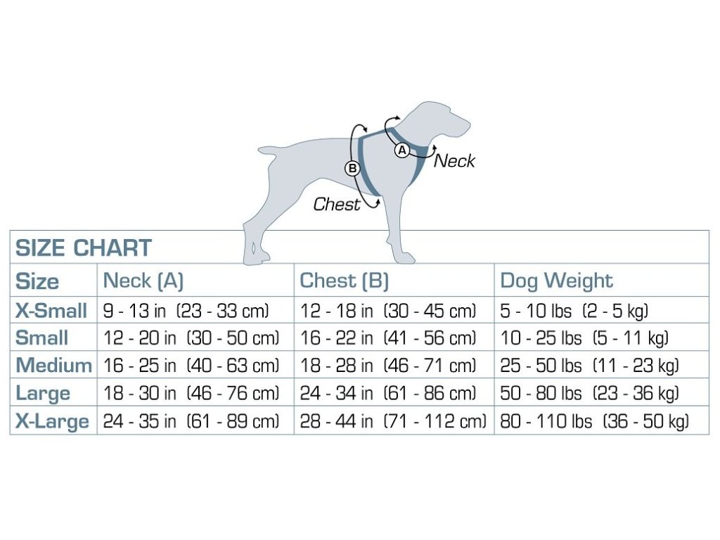 | Doporučená velikost | Obvod krku (A) v cm | Obvod hrudníku (B) v cm | Hmotnost psa v kg |