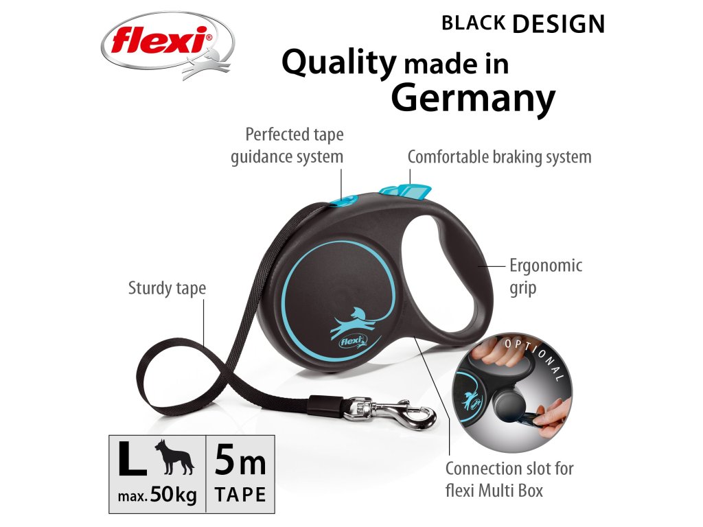 Černá je zpět! Vodítko z řady flexi® Black Design upoutá pozornost na první pohled. Výrazné barvy elegantně kontrastují s černým pouzdrem. Moderní design lze zároveň kombinovat s praktickými doplňky flexi®.