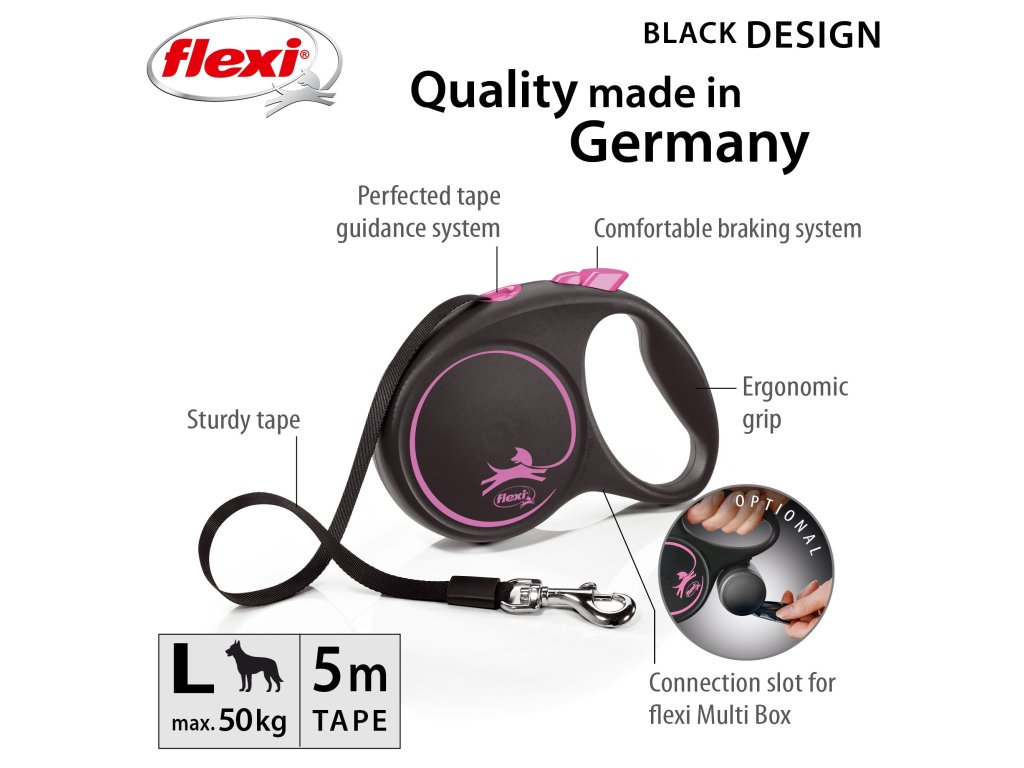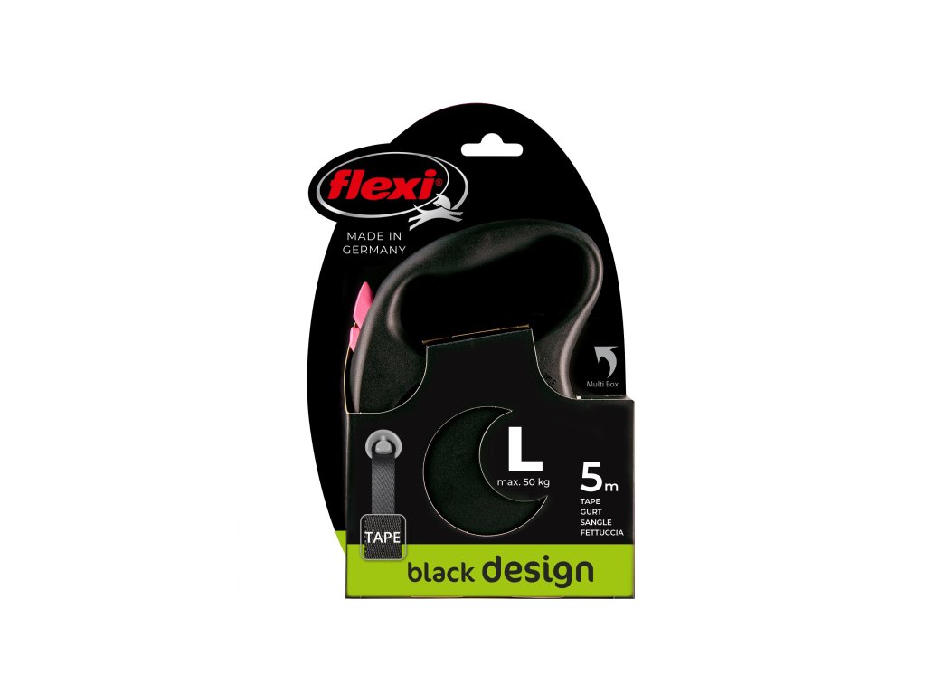 Černá je zpět! Vodítko z řady flexi® Black Design upoutá pozornost na první pohled. Výrazné barvy elegantně kontrastují s černým pouzdrem. Moderní design lze zároveň kombinovat s praktickými doplňky flexi®.