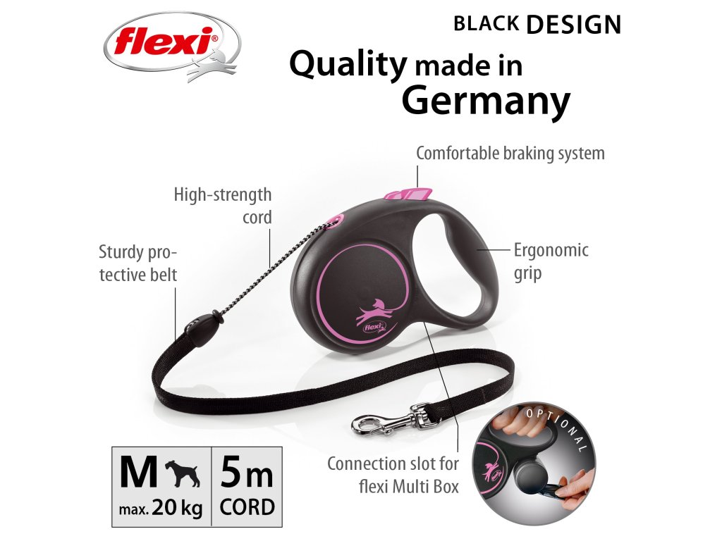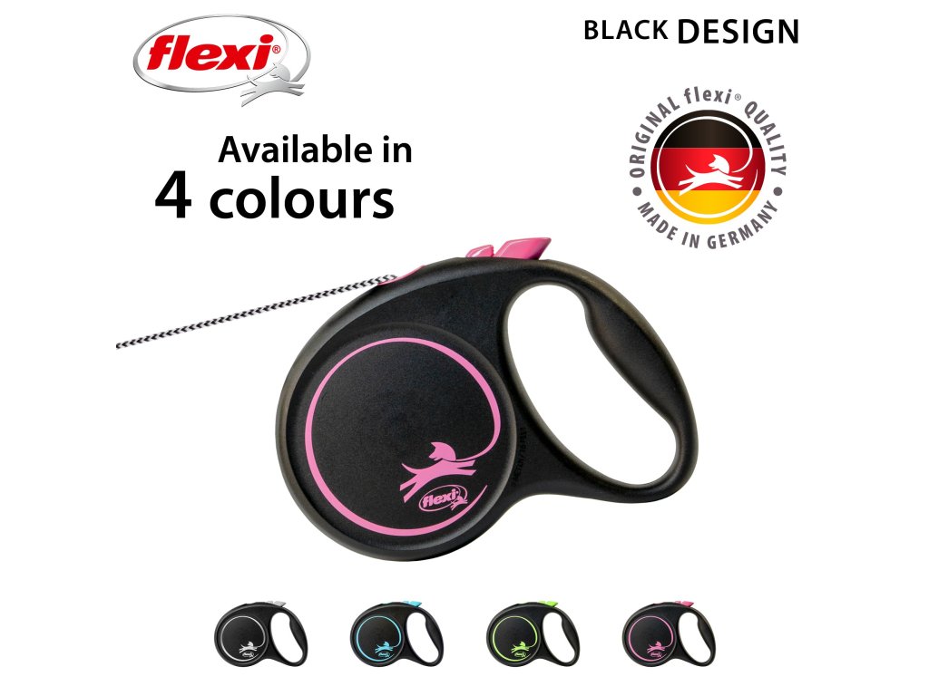 Černá je zpět! Vodítko z řady flexi® Black Design upoutá pozornost na první pohled. Výrazné barvy elegantně kontrastují s černým pouzdrem. Moderní design lze zároveň kombinovat s praktickými doplňky flexi®.