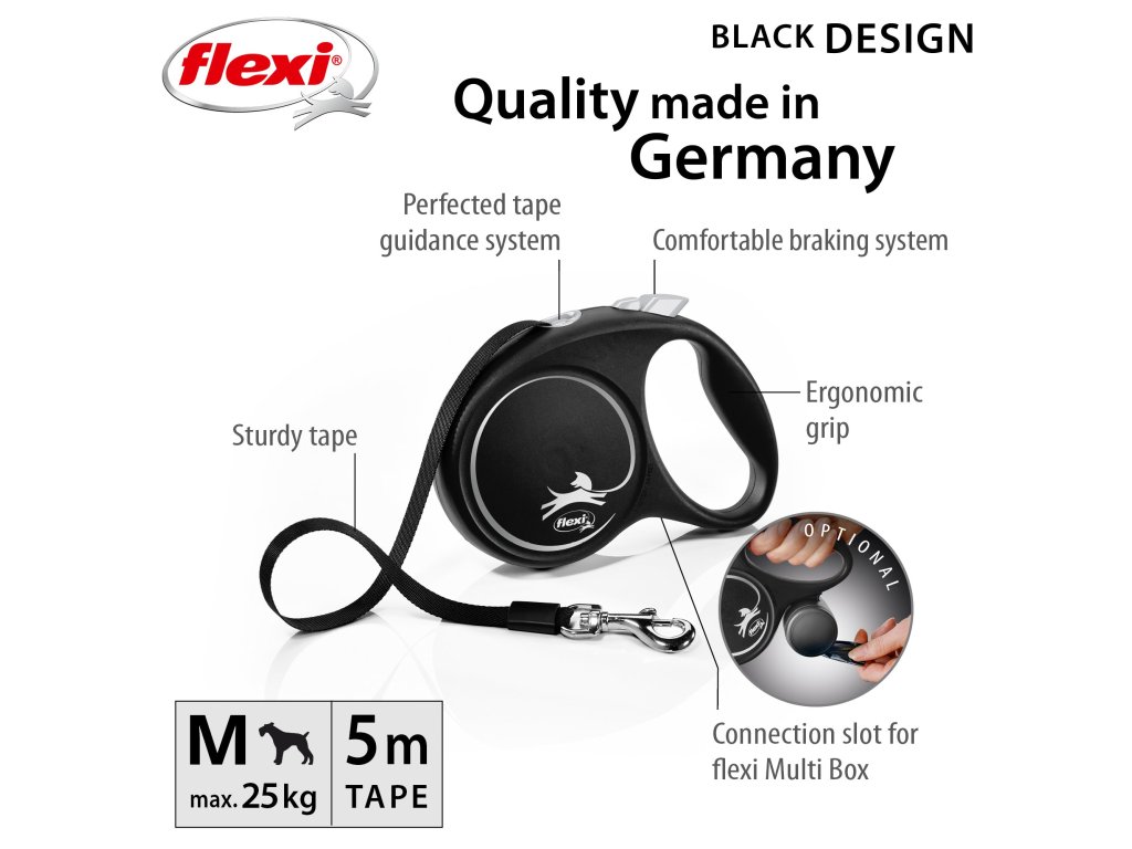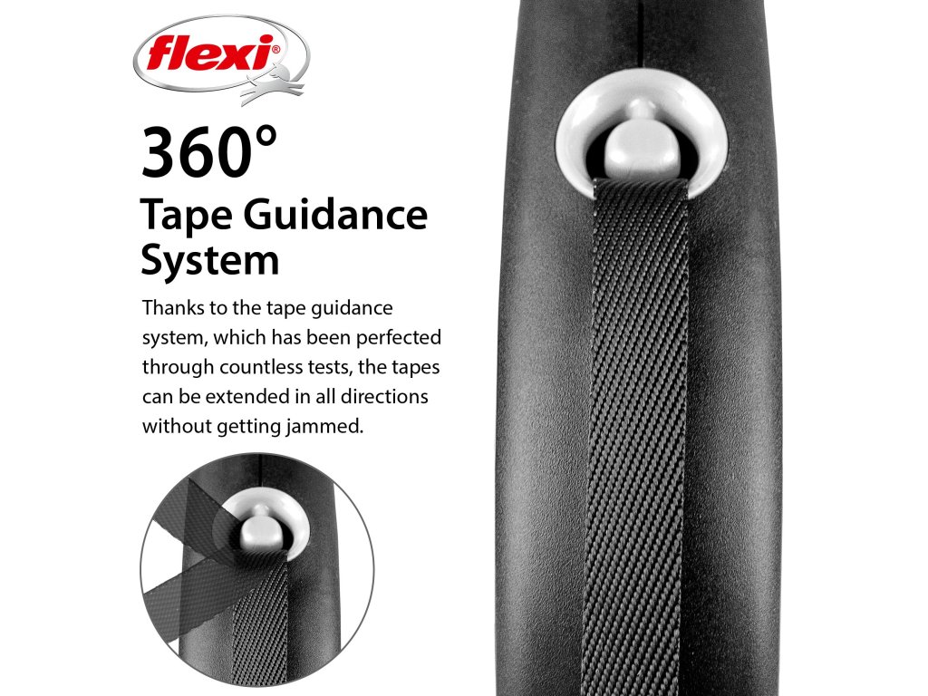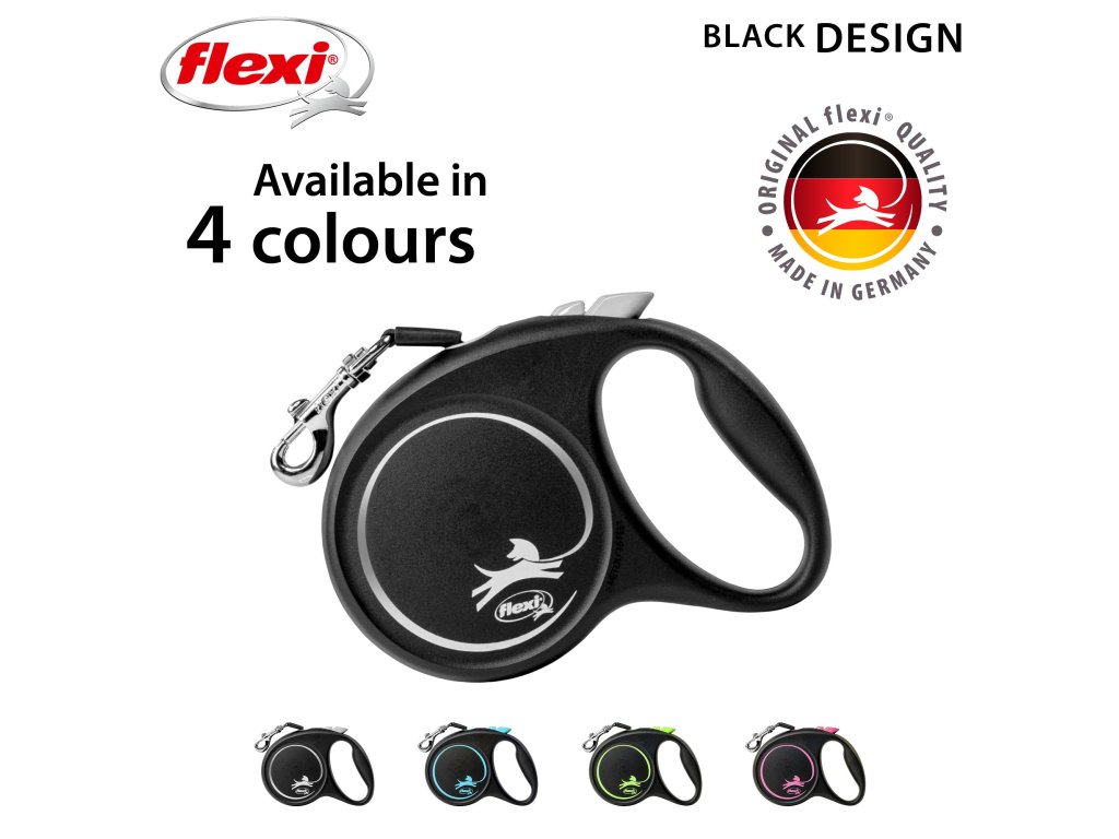 Černá je zpět! Vodítko z řady flexi® Black Design upoutá pozornost na první pohled. Výrazné barvy elegantně kontrastují s černým pouzdrem. Moderní design lze zároveň kombinovat s praktickými doplňky flexi®.
