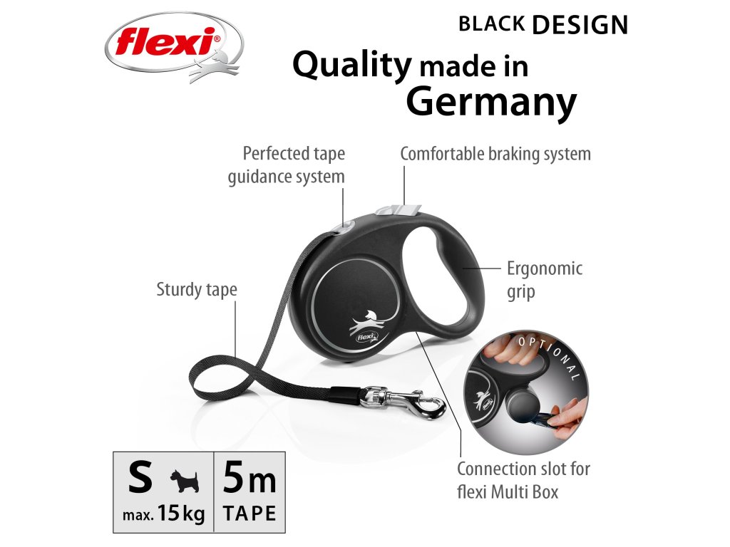 Černá je zpět! Vodítko z řady flexi® Black Design upoutá pozornost na první pohled. Výrazné barvy elegantně kontrastují s černým pouzdrem. Moderní design lze zároveň kombinovat s praktickými doplňky flexi®.