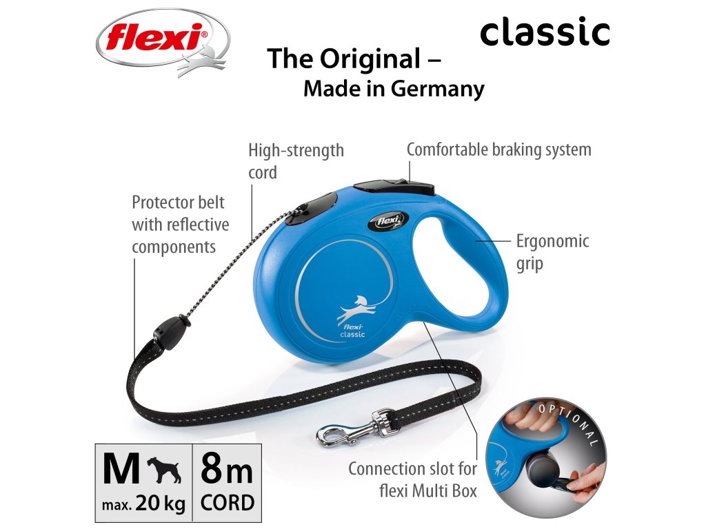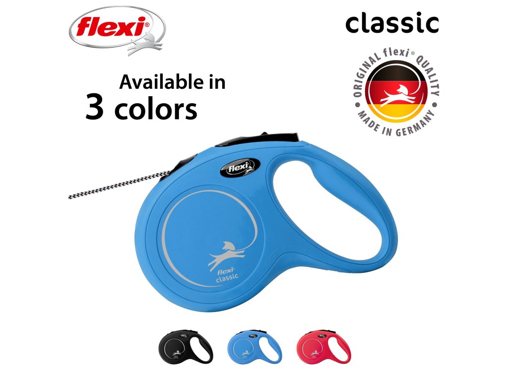 Vodítka flexi® classic nabízí pohodlný úchop, odolný navíjecí systém i kvalitní, bezpečný a intuitivní brzdný systém, který ve zlomku vteřiny zastaví pohyb psa. Pro snadné upevnění vodítka k obojku nebo postroji je vodítko opatřeno chromovanou karabinou. Moderní design lze zároveň kombinovat s praktickými doplňky flexi® Multi Box a flexi® LED osvětlením (kromě velikosti XS).