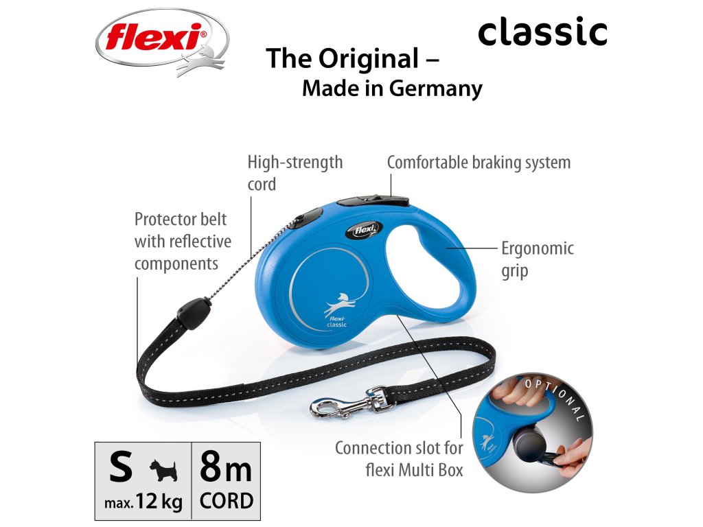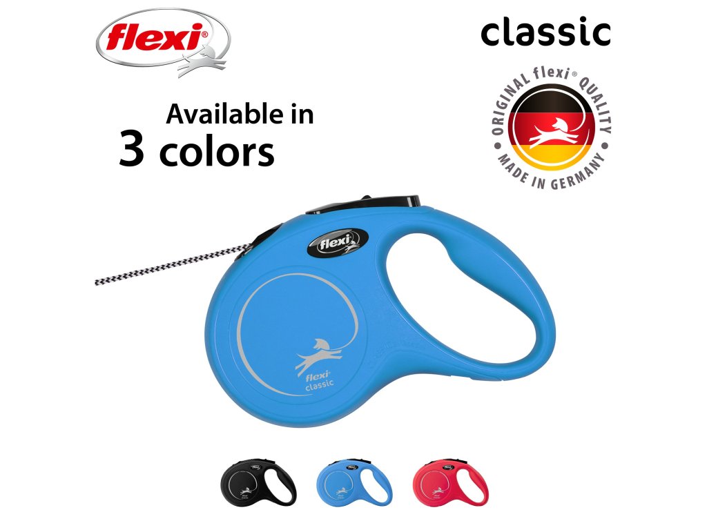 Vodítka flexi® classic nabízí pohodlný úchop, odolný navíjecí systém i kvalitní, bezpečný a intuitivní brzdný systém, který ve zlomku vteřiny zastaví pohyb psa. Pro snadné upevnění vodítka k obojku nebo postroji je vodítko opatřeno chromovanou karabinou. Moderní design lze zároveň kombinovat s praktickými doplňky flexi® Multi Box a flexi® LED osvětlením (kromě velikosti XS).