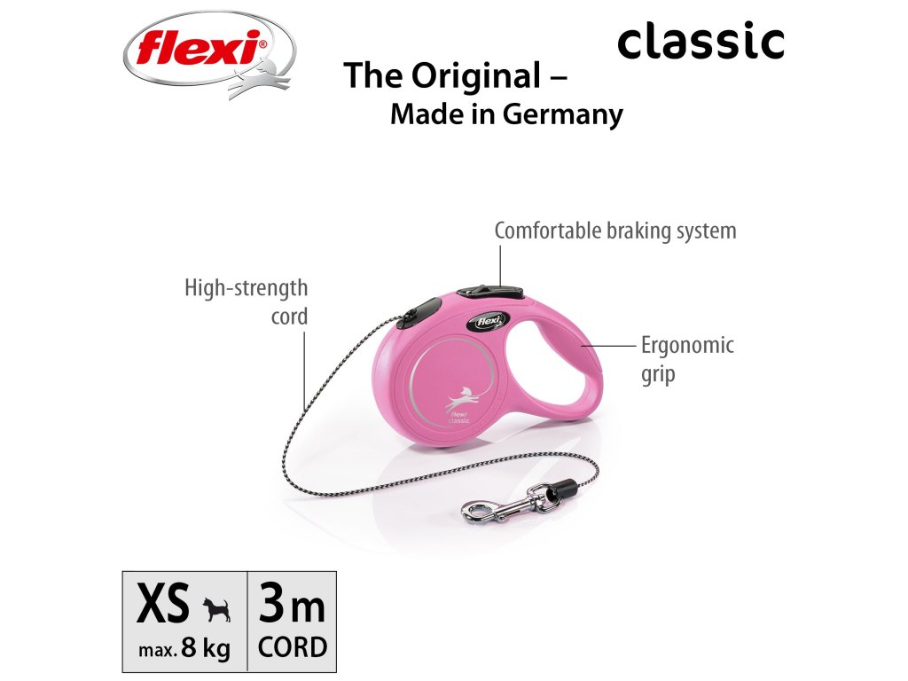 Vodítka flexi® classic nabízí pohodlný úchop, odolný navíjecí systém i kvalitní, bezpečný a intuitivní brzdný systém, který ve zlomku vteřiny zastaví pohyb psa. Pro snadné upevnění vodítka k obojku nebo postroji je vodítko opatřeno chromovanou karabinou. Moderní design lze zároveň kombinovat s praktickými doplňky flexi® Multi Box a flexi® LED osvětlením (platí pro velikost S, M a L).