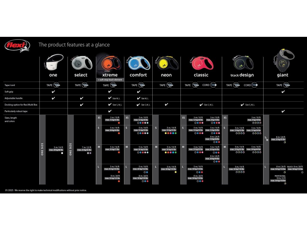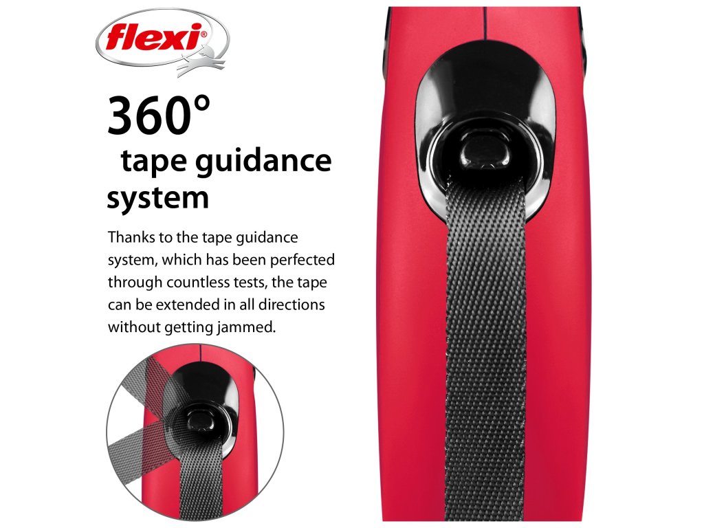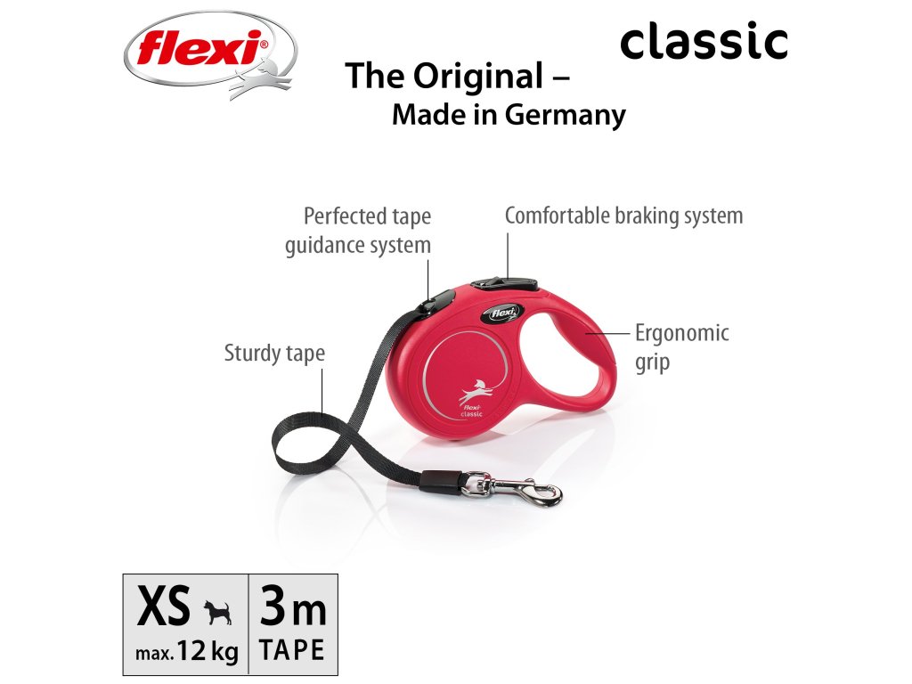 Vodítka flexi® classic nabízí pohodlný úchop, odolný navíjecí systém i kvalitní, bezpečný a intuitivní brzdný systém, který ve zlomku vteřiny zastaví pohyb psa. Pro snadné upevnění vodítka k obojku nebo postroji je vodítko opatřeno chromovanou karabinou. Samozřejmostí je zdokonalený výstup pásku, který zajišťuje manipulaci v libovolném směru bez zasekávání - potvrzeno nesčetnými testy.