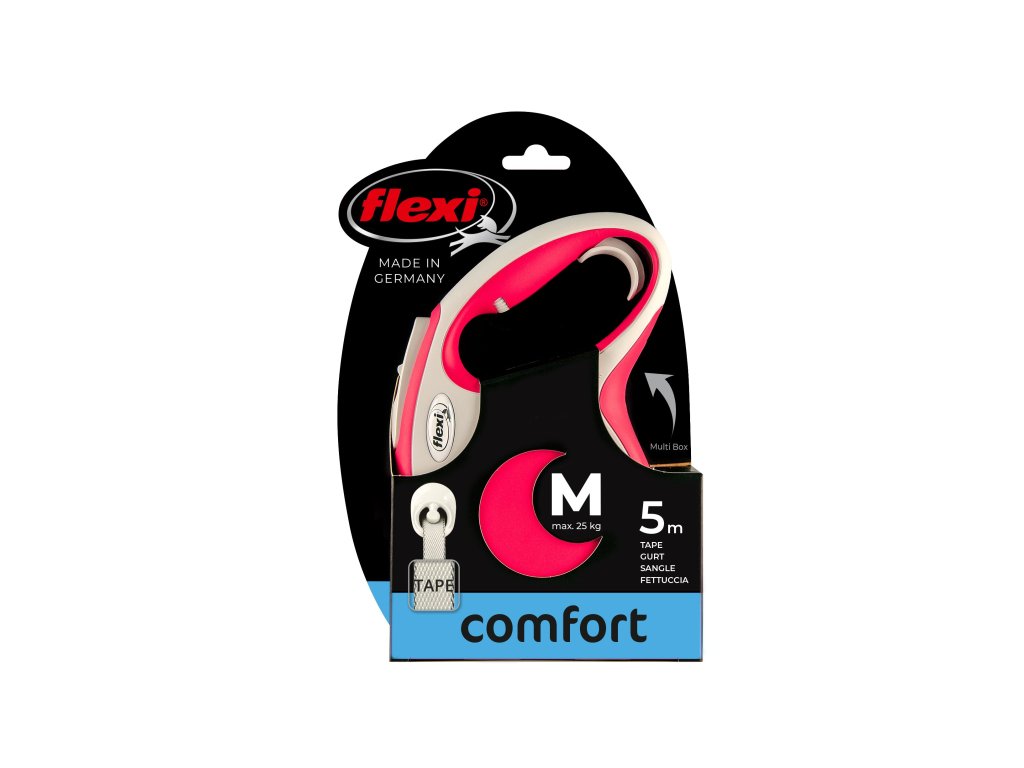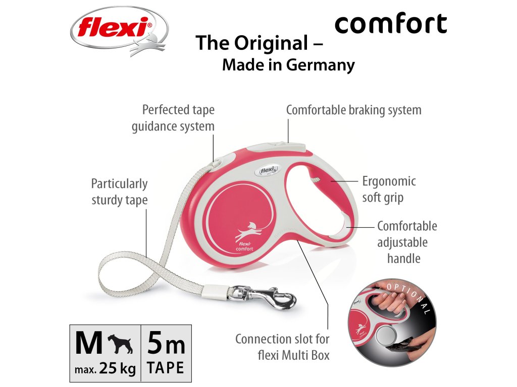 Pohodlné a díky svému dokonale sladěnému designu i unikátní - to je vodítko flexi® comfort, které nabízí Vašemu čtyřnohému příteli vše, co psi milují: pohyb, pohyb a ještě jednou pohyb! Vás jistě potěší extra pohodlná, měkká rukojeť (ve velikosti M a L je navíc nastavitelná) i zdokonalený výstup a vedení pásku všemi směry bez zasekávání. Na každé procházce oceníte i bezpečný a intuitivní brzdný systém, který ve zlomku vteřiny zastaví pohyb pásku. Pro snadné upevnění vodítka k obojku nebo postroji je vodítko opatřeno kvalitní chromovanou karabinou. Kompatibilní s praktickými doplňky flexi® Multi Box a flexi® LED osvětlením (platí pro velikost S, M a L).