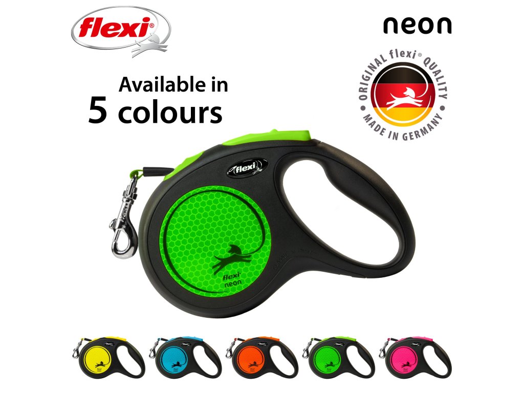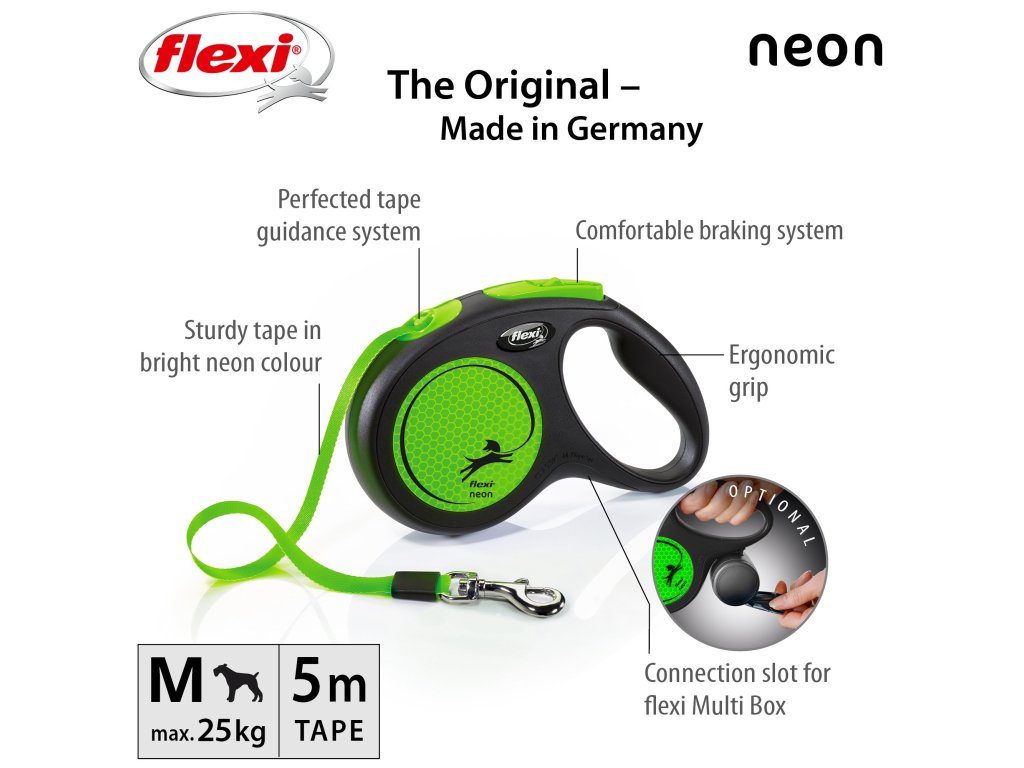 Flexi® Neon zároveň nabízí i nesčetnými testy zdokonalený výstup a vedení pásku všemi směry bez zasekávání. S délkou 5 m poskytuje Vašemu parťákovi potřebnou volnost pohybu.