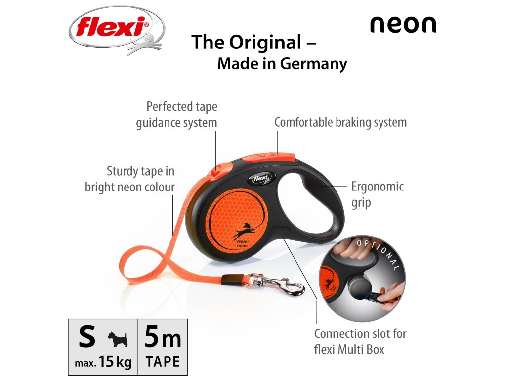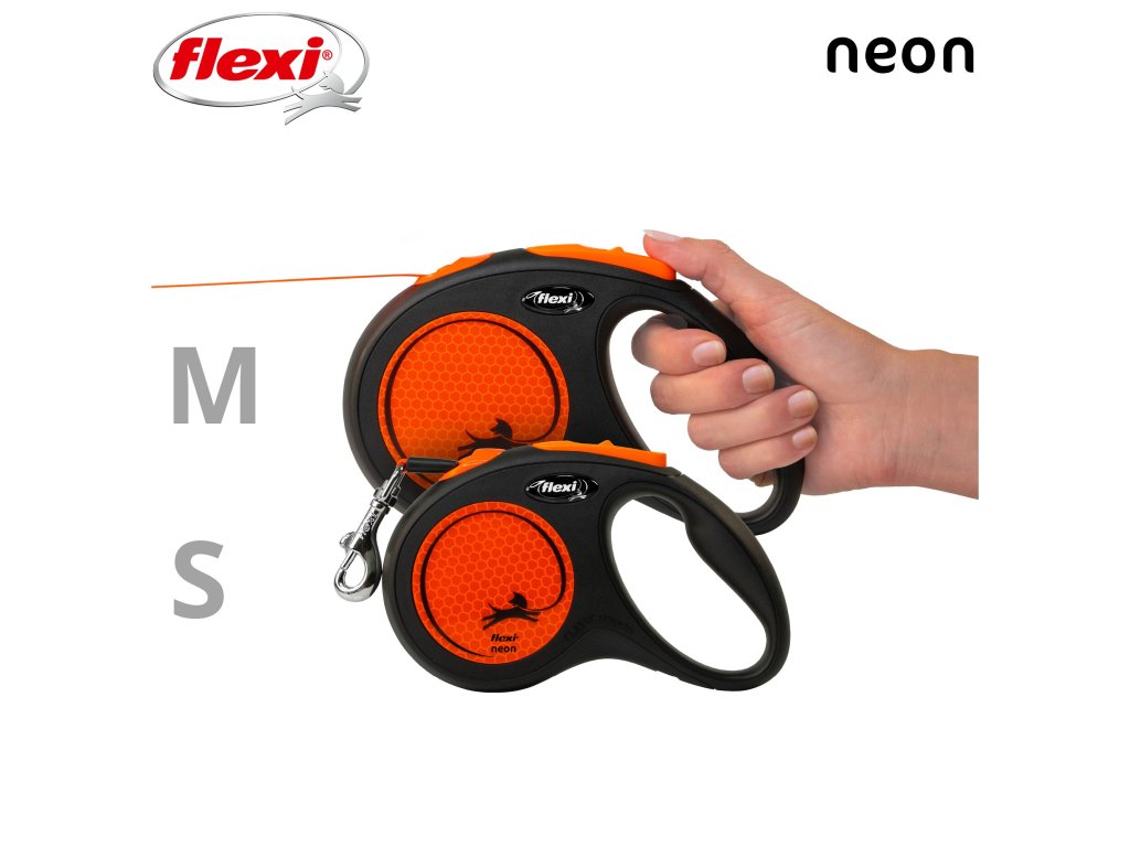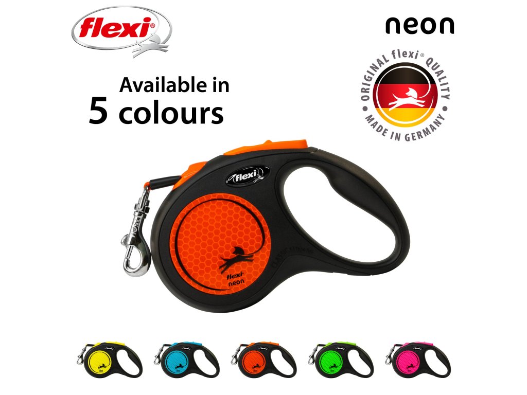 Flexi® Neon zároveň nabízí i nesčetnými testy zdokonalený výstup a vedení pásku všemi směry bez zasekávání. S délkou 5 m poskytuje Vašemu parťákovi potřebnou volnost pohybu.