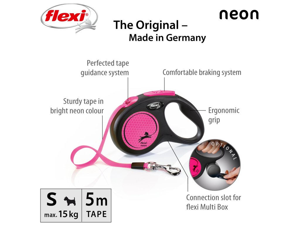 Flexi® Neon zároveň nabízí i nesčetnými testy zdokonalený výstup a vedení pásku všemi směry bez zasekávání. S délkou 5 m poskytuje Vašemu parťákovi potřebnou volnost pohybu.