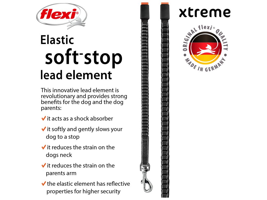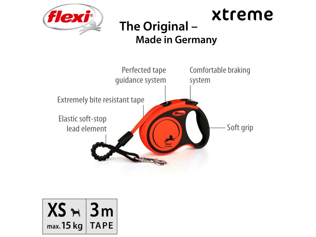 Extrémně odolné vodítko nejen pro milovníky adrenalinu. Ať už je Váš čtyřnohý parťák obzvlášť aktivní nebo vás čekají dobrodružné výzvy, flexi® Xtreme nabízí ještě větší bezpečnost s extrémně odolným páskem flexi® X11 a více pohodlí díky integrovanému tlumiči Soft-Stop. K většímu bezpečí připívá i výrazná barva, která je snadno rozpoznatelná z dálky i za soumraku. Protože čím delší je vodítko, tím důležitější je, aby bylo dobře viditelné. Pro Vaše pohodlí disponuje flexi® Xtreme ve velikostech M a L nastavitelnou rukojetí. Rukojeť lze přizpůsobit velikosti Vaší ruky pro pevný úchop na každé procházce. Samozřejmostí je i nesčetnými testy zdokonalený výstup a vedení pásku všemi směry bez zasekávání.