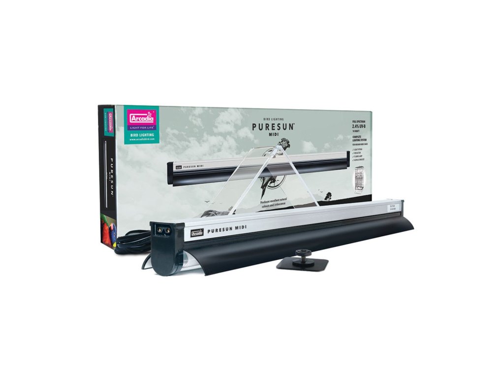Arcadia Bird PureSun-Mini a Arcadia Bird PureSun-Midi je kompletní osvětlovací systém, který se snadno instaluje a používá, má moderní design a poskytuje ptákům plné sluneční spektrum, včetně UVB záření.