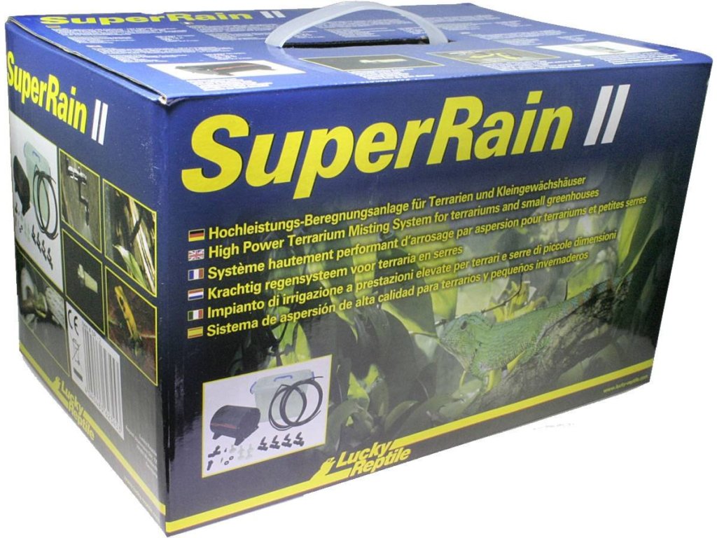 Super Rain II je extrémně silné zařízení pro velká terária, sestavy terárií nebo malé skleníky. Základní sadu lze libovolně rozšiřovat, Super Rain II může fungovat s 15 tryskami nebo drippery najednou!