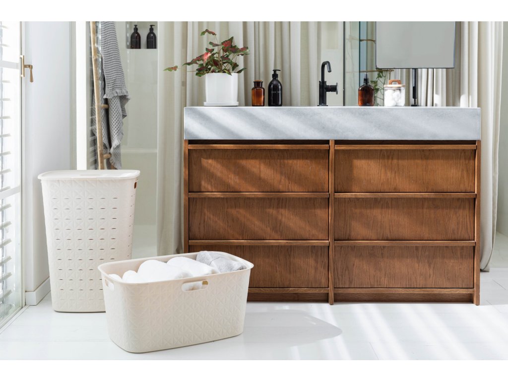 Koš na špinavé prádlo o objemu 56 l, inspirovaný technikou tkaní a prošívání, která vytváří plastický vzor. Tento stylový a zároveň praktický doplněk dodá domovu luxusní a přátelský nádech. Tento koš se nejen pohodlně nosí, ale je také udržitelný, protože je vyroben ze 70 % z recyklovaných materiálů.