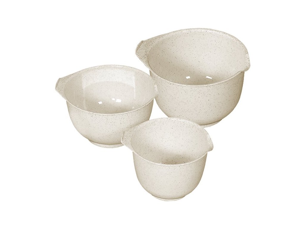 Tři kuchyňské mísy různých velikostí. Hodí se k zadělávání těsta, mixování krému a přípravě různých potravin. Jejich velikost a design jsou navrženy tak, aby se bez problému vešly jedna do druhé a našly si své místo ve vaší kuchyni. Jsou lehké, praktické a dají se mýt v myčce.