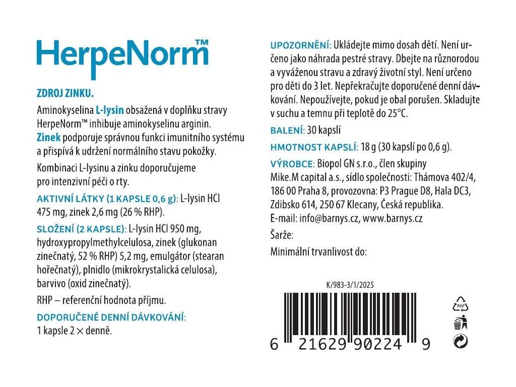 Aminokyselina L-lysin obsažená v doplňku stravy HerpeNorm™ inhibuje aminokyselinu arginin. Pokud se s diskomfortem setkáváte častěji, měli byste se vyhýbat potravinám bohatým na arginin (např. ořechy) a omezit příjem potravin s obsahem bílé mouky, rýže, dále polotovarů a potravin s vysokým obsahem cukru.